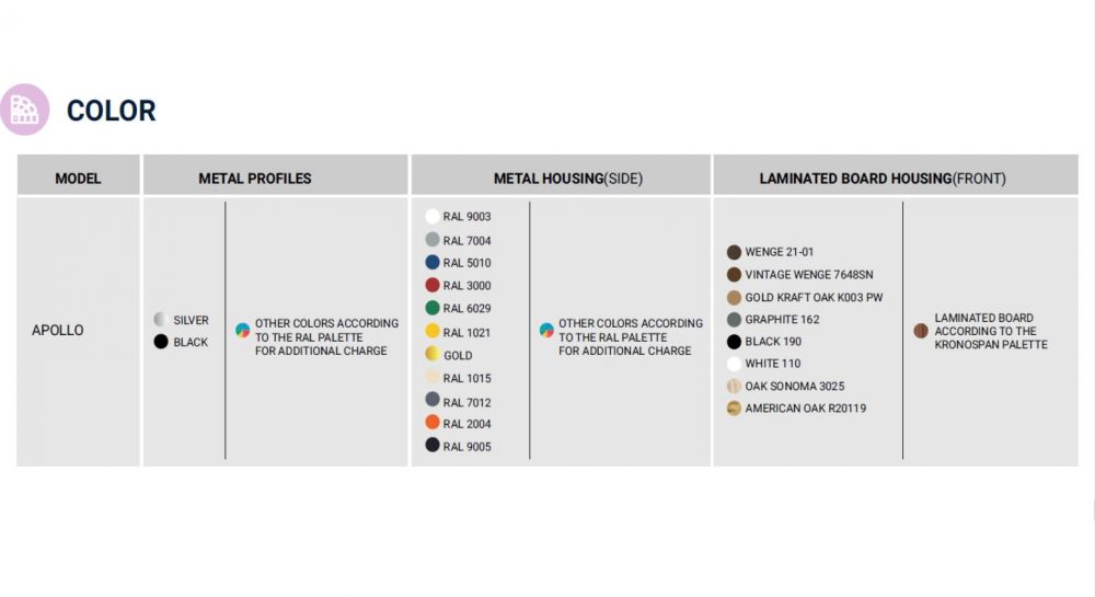 - Any colour of casing from RAL palette- Any colour of metal elements from RAL palette