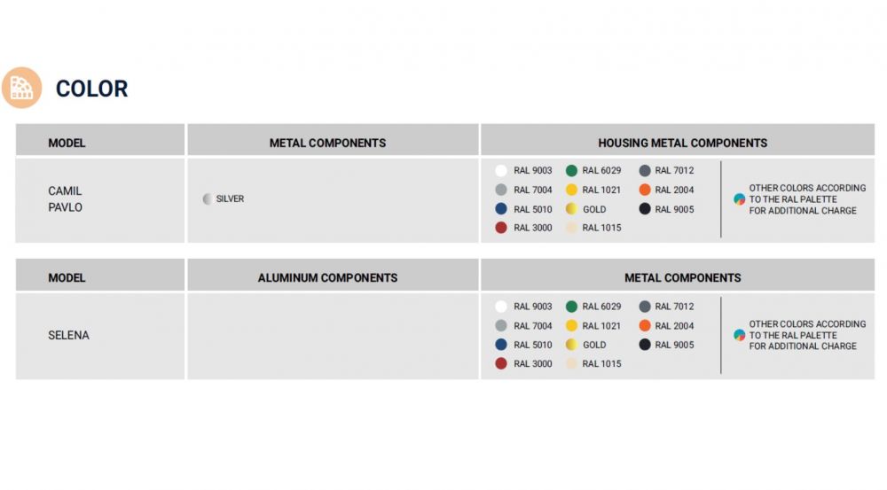 - Painting glass frame on silver or white color- Any colour of metal elements from RAL palette
