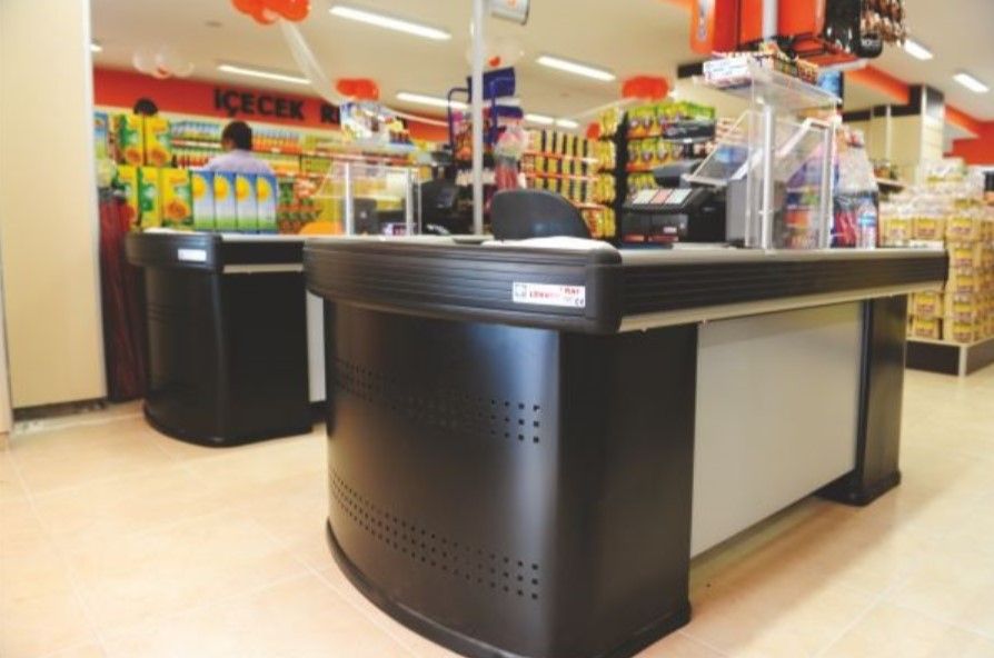 - L-shaped cash boxes are available in two sizes without a conveyor belt, so you can choose between 160 x 110 cm or 185 x 110 cm- L-shaped cash boxes are available in three sizes with a conveyor belt, so you can choose between 210 x 110 cm, 240 x 110 cm or 270 x 110 cm