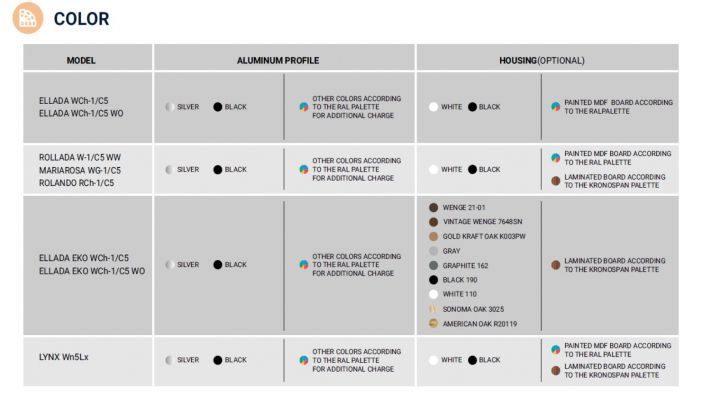 - Any colour of casing from RAL palette- Any colour of metal elements fro RALL palette