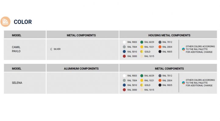 - Any colour of metal elements from RAL palette- Painting glass frame on silver or white