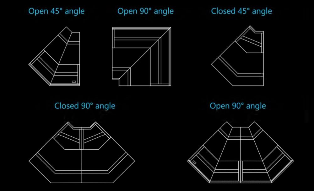 | Length: | Angle 45°open - 90°open - 45° closed - 90 ° open - 90° closed |