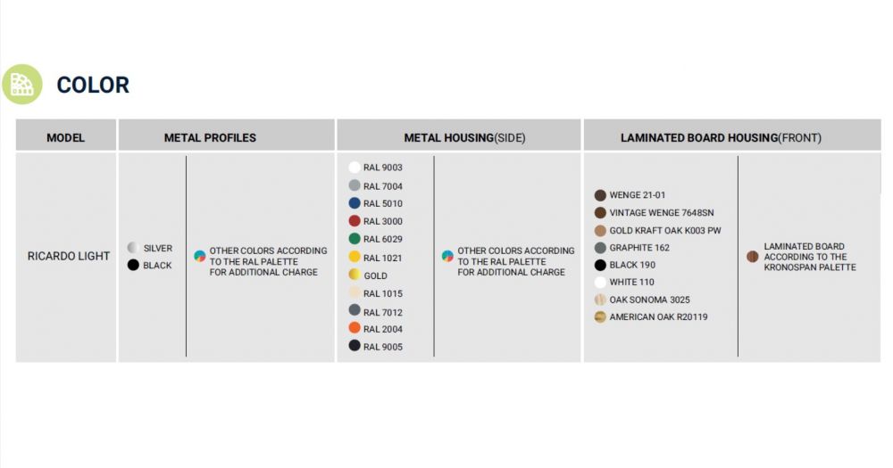 - Outer front casing: laminated board according to teh KRONOSPAN palette- Varnished steel side according to the RAL palette